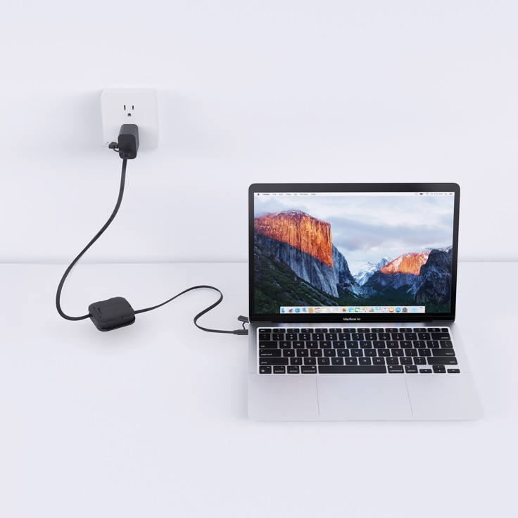 A great example: a 100W charging phone stand with an integrated retractable cable, combining convenience, speed and desk-friendly design. It has a magnetic surface and kickstand for secure, hands-free viewing, as well as a retractable cable that extends up to 100cm and supports super-fast charging. It is made from 59% RCS (Recycled Claim Standard) certified recycled materials.