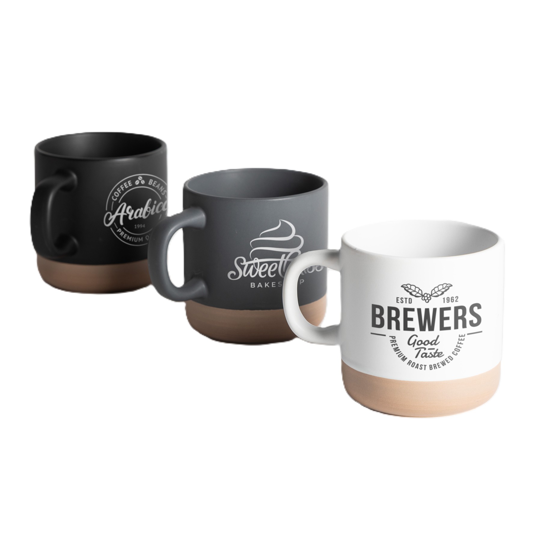 A contemporary and tactile matt ceramic mug with a natural base. Available in black, grey and white. Suitable for microwave and dishwasher use. The mug can be printed in one colour to each side. Product dimensions 88 x 88mm.