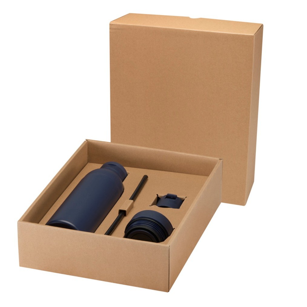 This gift set includes a 650ml double-walled, vacuum-insulated bottle made from RCS certified stainless steel with copper plating for enhanced temperature retention. The bottle is compatible with three interchangeable lids included in the set. Lid one features a discreet built-in silicone handle for easy carrying. Lid two is a sports lid with a flip-top drinking spout and straw. Lid three has a convenient stainless steel push-top opening, allowing for one-handed use. The set is presented in a recycled cardboard gift box, making it a practical and thoughtful gift. Available in navy with a range of engraving and print personalisation options, in up to four spot colours.