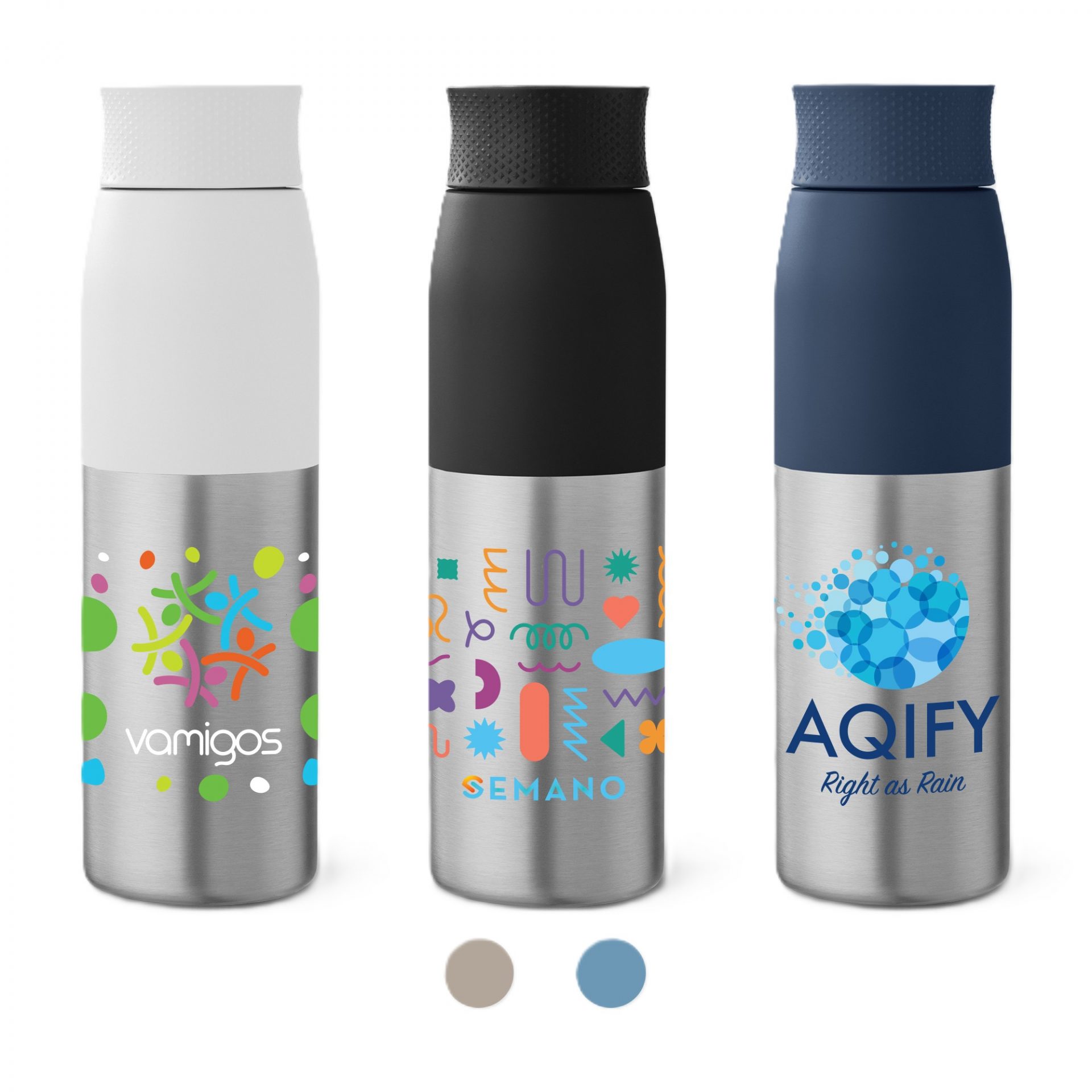 A quality double-wall vacuum insulated bottle that will keep drinks hot for up to eight hours and cold for up to 10 hours. The leakproof design features a textured lid with a matt top that matches the solid-coloured top section of the bottle. Crafted from 304 stainless steel with a brushed finish. The bottle is available in five contemporary colours. It can be personalised through a spot colour silkscreen print in a range of colours, or a large full colour wrap, to the metal part of the product. The print sits on this finish, giving it a slightly raised, tactile appearance. Product dimensions 248 (h) x 73 (d) mm.